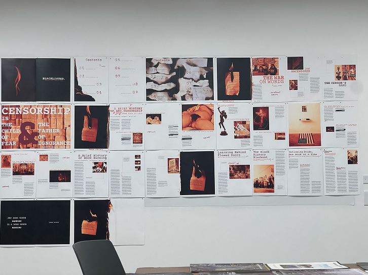 Inside the publication, the redaction textures continue across the spreads, creating a consistent reminder of how information can be obscured or controlled. Each chapter divider marks the slow arrival of fire, starting at the edges and intensifying as the book moves forward. By the final section, the flames have overrun the pages, burning through the text until it becomes unreadable. This visual progression mirrors the accelerating danger of censorship, revealing how quickly expression can be erased once suppression begins.