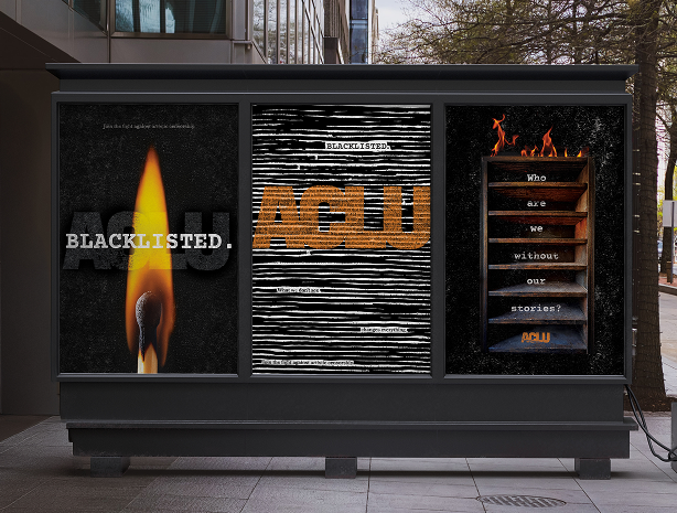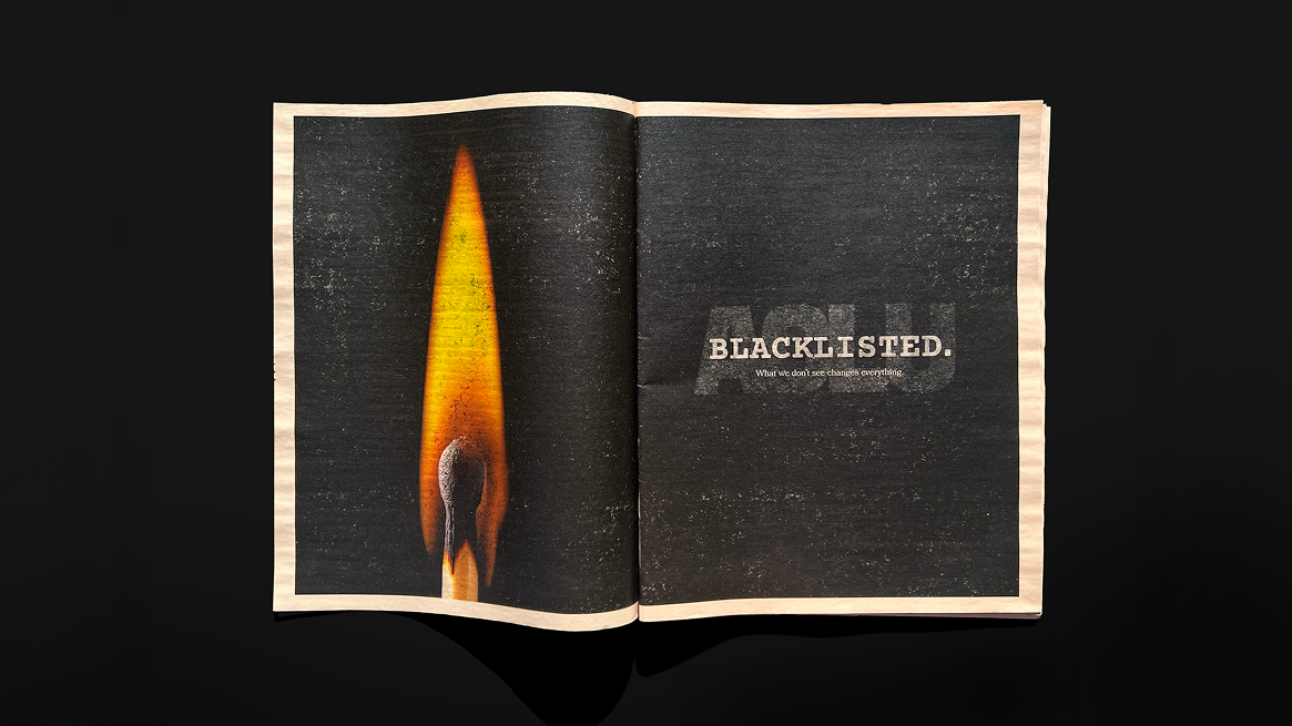 Blacklisted. is a publication project I designed in response to the ACLU’s work against the censorship of artistic expression. Developed within a guided design brief, the piece examines how book bans and obscenity laws allow institutions to restrict whose stories are told and which ideas the public is allowed to access. The visuals lean into literary symbolism, using analog redaction textures, scorched typography, and pages engulfed in flames to show how expression can be erased in both quiet and catastrophic ways. By combining these distressed graphic elements with the stark language of censorship, Blacklisted. makes the danger feel immediate and personal, reminding viewers that when art is silenced, imagination, individuality, and democratic freedom are silenced with it.