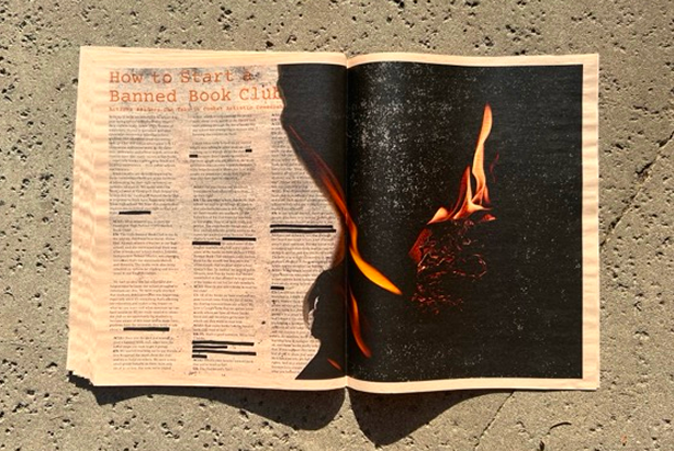 Inside the publication, the redaction textures continue across the spreads, creating a consistent reminder of how information can be obscured or controlled. Each chapter divider marks the slow arrival of fire, starting at the edges and intensifying as the book moves forward. By the final section, the flames have overrun the pages, burning through the text until it becomes unreadable. This visual progression mirrors the accelerating danger of censorship, revealing how quickly expression can be erased once suppression begins.
