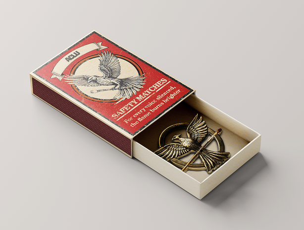 Included with the publication is a small resistance pin designed to extend the message of Blacklisted. beyond the printed page. It draws inspiration from symbols of defiance found in banned literature and acts as a reminder that creative expression survives even in the face of suppression. Engraved with a call to rise and paired with subtle ACLU branding, the pin is meant to be worn as a quiet declaration of solidarity with artists, writers, and thinkers whose voices risk being erased. Its matchbox-inspired packaging reinforces the idea that resistance can begin as a spark, carrying the spirit of the project forward in a way that is both personal and enduring.