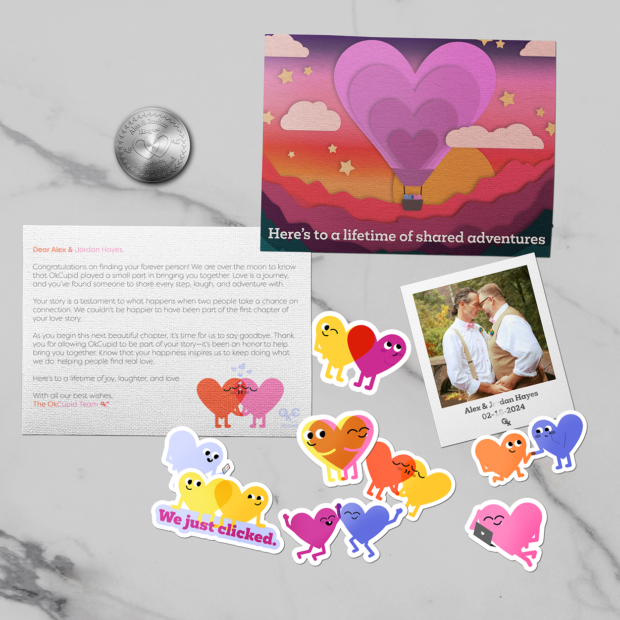 The Happily Ever After Package is a heartfelt keepsake created for couples who first found each other on OkCupid and chose to write the rest of their story side by side. It marks the sweetest final chapter of their OkCupid journey, a moment to pause and celebrate the magic that can begin with a single match. After submitting a request through the OkCupid website, newlyweds receive a bundle filled with love and intention: a congratulatory note from the OkCupid team, a limited edition art print, a handful of Heartsies stickers, a custom decision-making token engraved with their names and anniversary, and a printed Polaroid of a photo they upload.